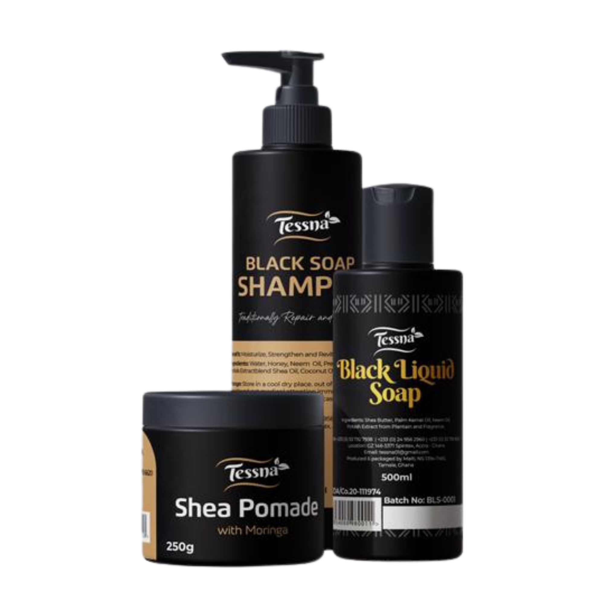 Explore our natural cosmetic range, black soap shampoos, conditioners, toners, pomades, and more, made for healthy, glowing hair and skin without chemicals.